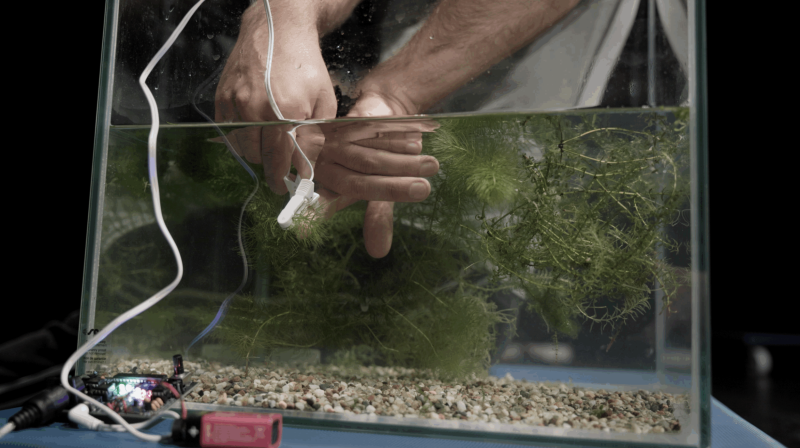 In einem rechteckigen Glasbecken mit Kiesboden und grünen, feinen Wasserpflanzen sind zwei menschliche Hände zu sehen, die bis zu den Handgelenken ins Wasser getaucht sind. Zwischen den Fingern halten sie einen weißen Sensor oder Clip, der über ein Kabel mit elektronischen Geräten außerhalb des Beckens verbunden ist. Am Beckenrand liegen kleine Steuerplatinen und Kabel, einige mit leuchtenden LEDs. Die Szene wirkt technisch-experimentell und zugleich poetisch – als würde das Wasser als Medium zwischen Mensch, Natur und Technologie erforscht.